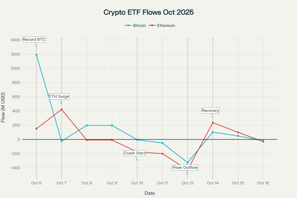 The cryptocurrency market experienced one of its most dramatic episodes in October 2025, as a perfect storm of geopolitical tensions, leverage liquidations, and institutional repositioning created unprecedented volatility across digital assets. While headlines initially suggested Ethereum ETFs dramatically outperformed Bitcoin funds, the reality reveals a more nuanced story of market stress, massive outflows exceeding $755 million in a single day, and a complex recovery pattern that offers crucial insights into institutional crypto investment behavior during extreme market conditions.