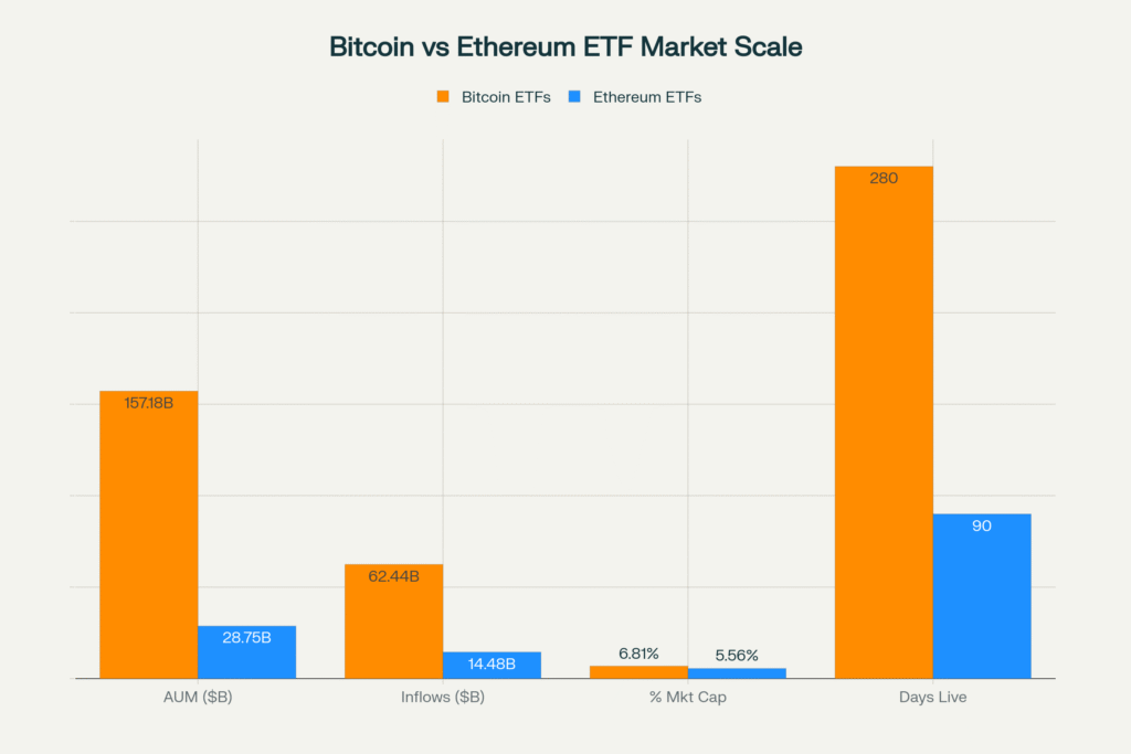 Ethereum ETFs demonstrated particularly strong performance in early October, with October 7 marking a standout day as ETH funds recorded $420.87 million in inflows while Bitcoin ETFs experienced modest $23.8 million outflows. BlackRock’s ETHA led this surge with $437.51 million in daily inflows, pushing the fund’s total inflows since launch to over $13 billion.